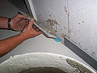 Nach dem Verfugen des Bodens wird der Estrichrandstreifen entfernt und der Fliesensockel mit Fliesenkleber auf die Wand geklebt.